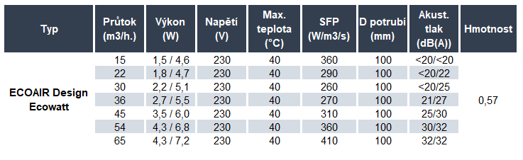 ECOAIR DESIGN M ECOWATT má velmi nízký příkon rovnající se slabé LED žárovce: 1,5 - 4,3 (7,2) W (boost) díky EC motoru.