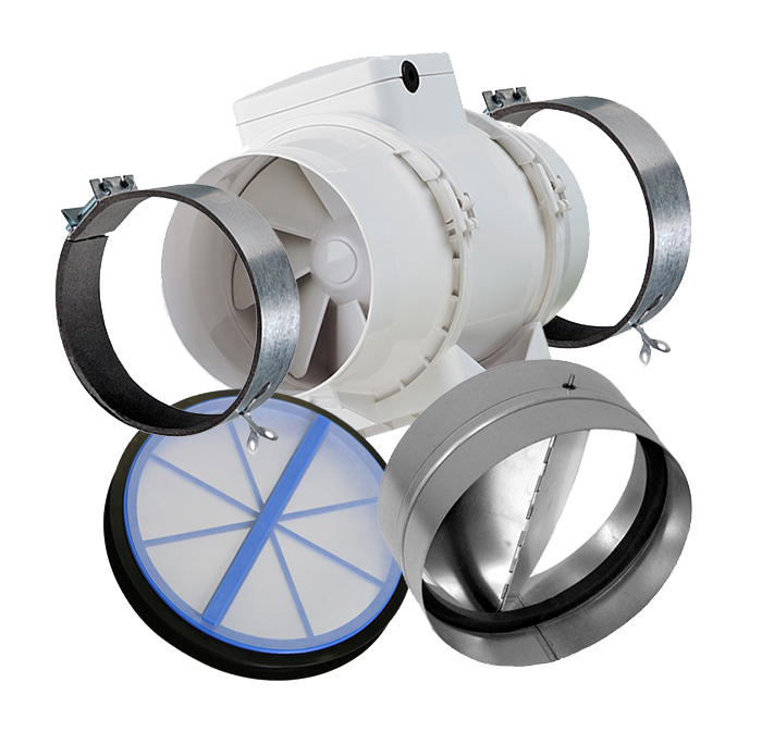 1x ventilátor, 2x tlumící manžetu a 1x pachotěsnou zpětnou klapku