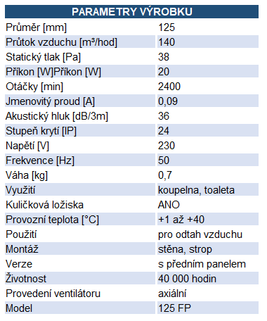 Designový ventilátor do koupelny FP 125 s předním panelem v bílé barvě o průměru 125 mm vyniká kromě elegantního čistého vzhledu i patentovaným motorem. Ten je vybaven kuličkovými ložisky, které zajišťují dlouhou životnost zařízení až 40 000 hodin nepřetržitého provozu. Díky tomu je navíc možné ventilátor instalovat v horizontální i vertikální poloze. Je vhodný pro odvětrání koupelen, WC, kuchyní, malých kanceláří a dalších prostor, které vyžadují pravidelnou ventilaci a kde délka větracího potrubí nepřesahuje 3 metry.
