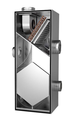 Vzduchotechnická jednotka DUPLEX RDH5-L se skládá z cirkulačního a odtahového ventilátoru vybaveného EC motorem nové generace, protiproudého rekuperačního výměníku, cirkulační a obtokové BY-PASS klapky se servopohony, teplovodního ohřívače, předfiltru čerstvého přiváděného a odváděného vzduchu z tahokovu a cirkulačního filtru s třídou filtrace G4.