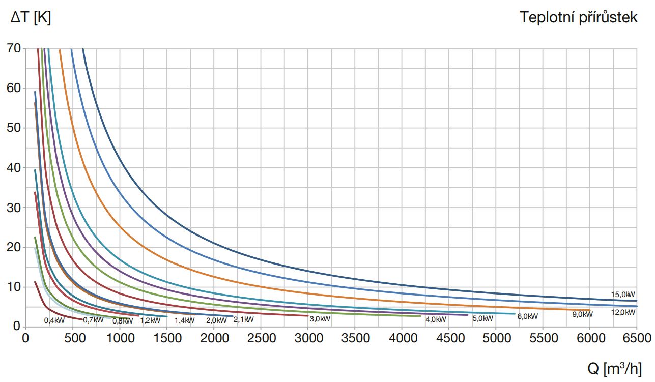 Graf teplotního přírustku při daném výkonu ohřívače a průtoku vzduchu