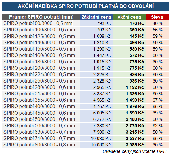 Spirálně vinutá roura z pozinku o průměru 80 - 1600 mm a délce 3000 mm. Síla materiálu dle platných norem EN 1505, EN 1506:2007 a EN 1507 (maximální deformace potrubí s ohledem na množství přetlaku/podtlaku).