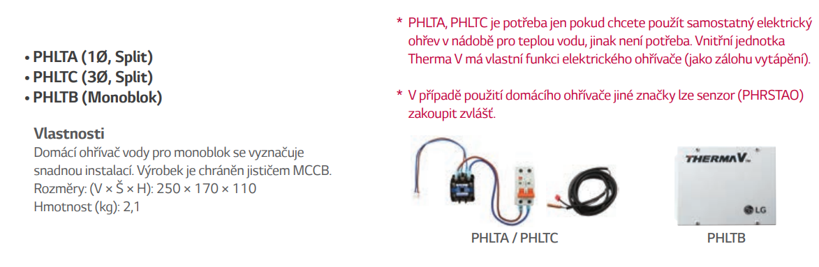 Instaluje se do vnitřní jednotky hydroboxu split LG THERMA V 1F. Vyžaduje napájení 230 V, které napájí topnou tyč zásobníku teplé vody. Ovládání probíhá prostřednictvím 230 V signálu z THERMA V. Snímač teploty zásobníku teplé vody musí být připojen k hlavní desce LG Therma V.