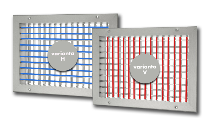 standardně dle montážních pružin. Na přání mřížky s předvrtanými otvory pro šrouby, upevnění pomocí magnetů nebo nastavitelných svorníků. Pro instalaci v horizontální poloze je nutné použít montáž pomocí šroubů nebo nastavitelných svorníků.